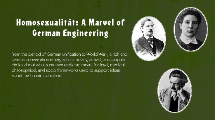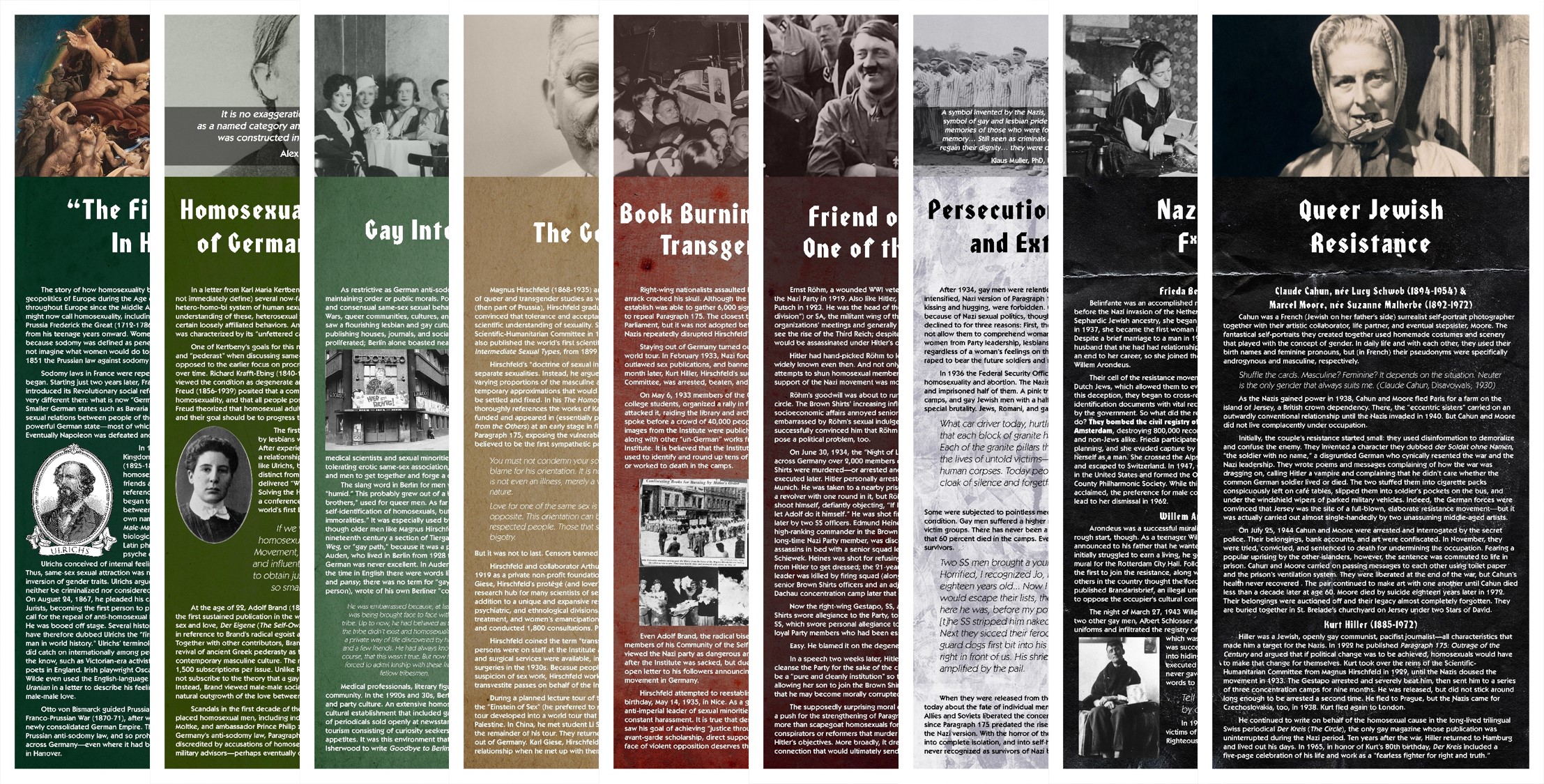 This exhibit features profiles of people and ideas that advanced the development of the modern gay, lesbian, and bisexual identities in Germany pre-1900 through the end of WWII, and gave voice and bodily expression to the transgender experience as early as the 1930s.