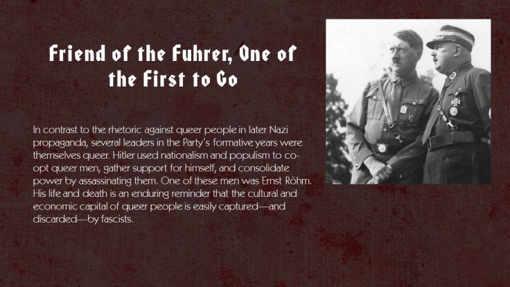 I brought a group of 8 students to see the exhibit displayed in UWM’s library. The students were overwhelmingly impressed by how much of this history had been completely glossed over or omitted in their previous history courses. I was particularly struck by the quality and emotional impact of the visual imagery used. This exhibit told a compelling and nuanced story about the horrific violence the Nazi regime inflicted on the German LGBTQ+ community, drawing attention to various identities and groups which are often overlooked in other treatments of this subject, particularly queer women. It was truly eye opening.