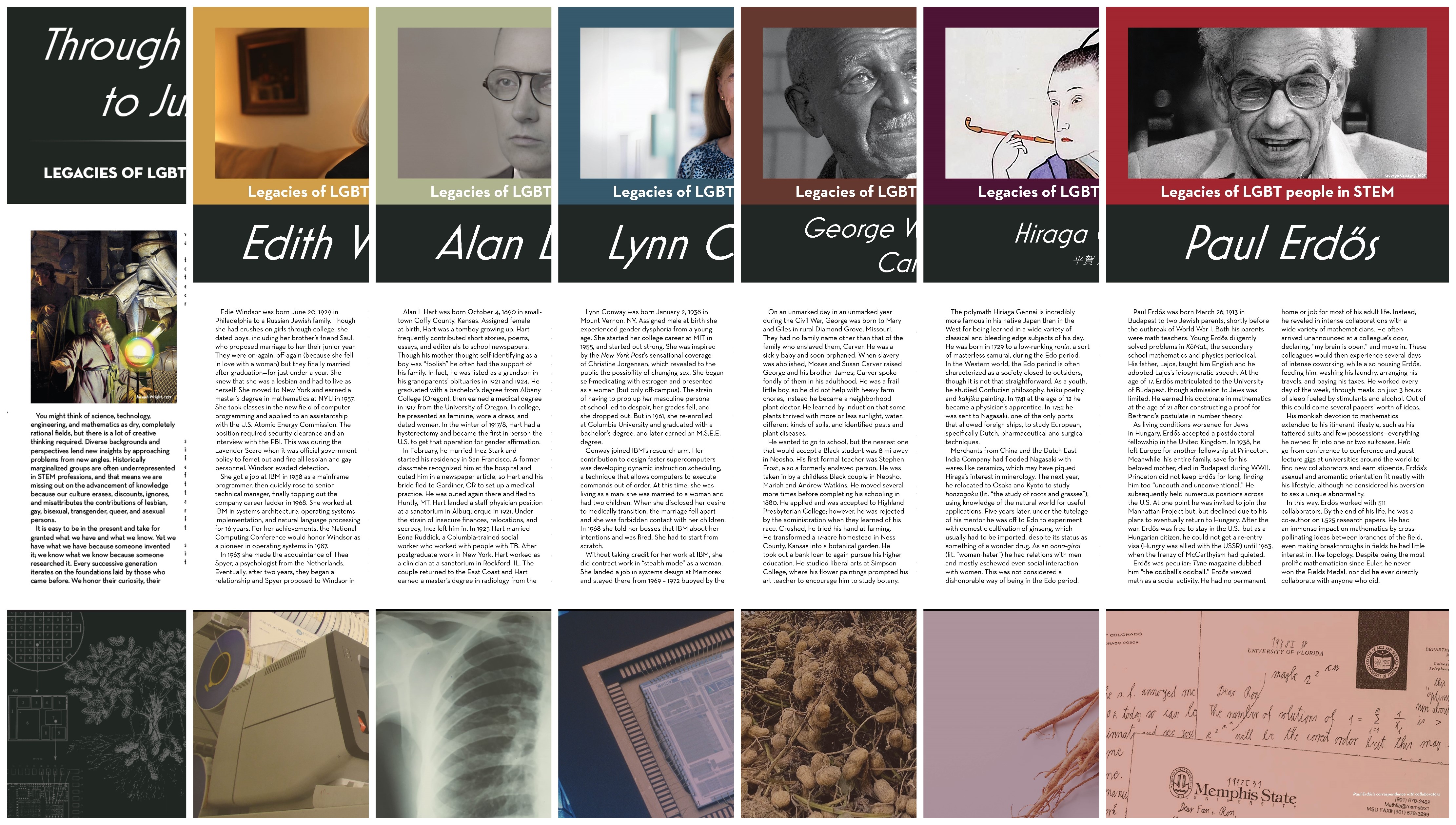 LGBTQ+ people are often recognized for work in the arts and humanities, but we work in all fields – including STEM! This exhibit celebrates the incredible contributions made by scientists, inventors, engineers, and mathematicians of every gender and sexual orientation.